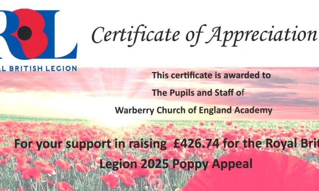 Thank you to all of our families for your generous donations to this year's Royal British Legion Poppy Appeal.