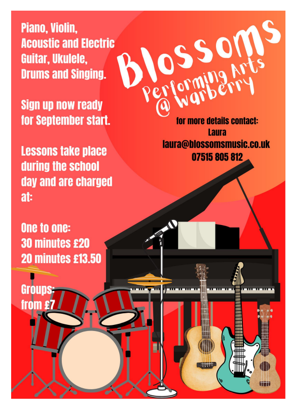 Blossoms also offer lessons at Warberry covering singing, ukulele, piano, guitar, drums and much more.